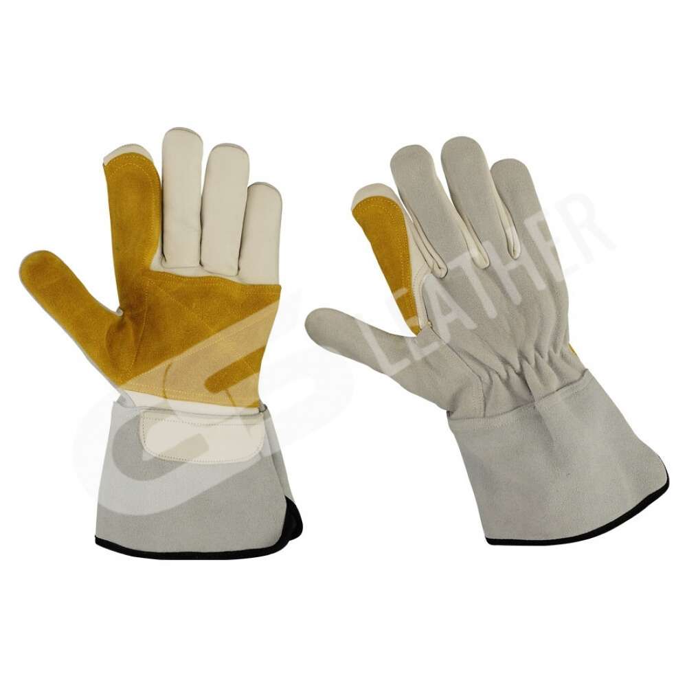 Palm cowhide leather gloves back crust split leather thumb back crust split with 8.CM cuff wing thumb index finger extra palm shirred elastic back piping.